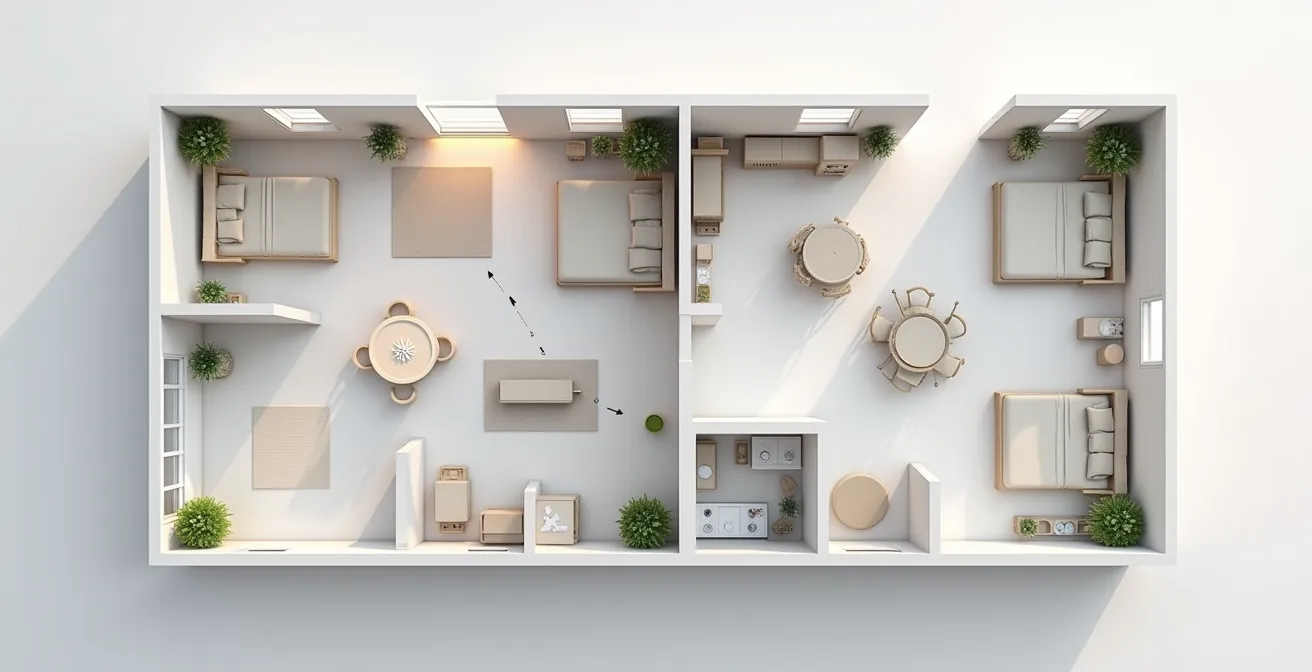- Le succès d’une transformation en colocation repose sur l’arbitrage spatial : convertir les m² de faible valeur (séjour, couloirs) en m² à haute valeur locative (chambres).